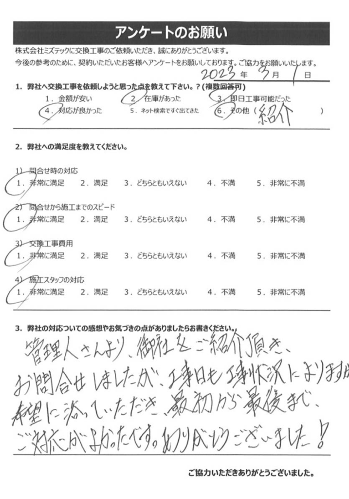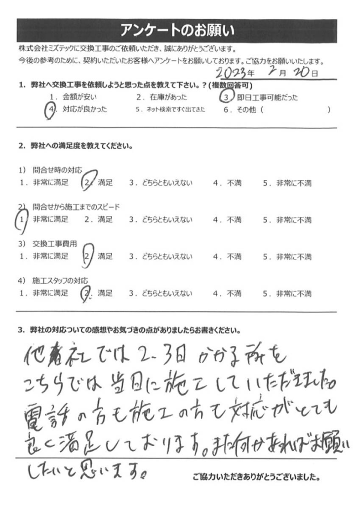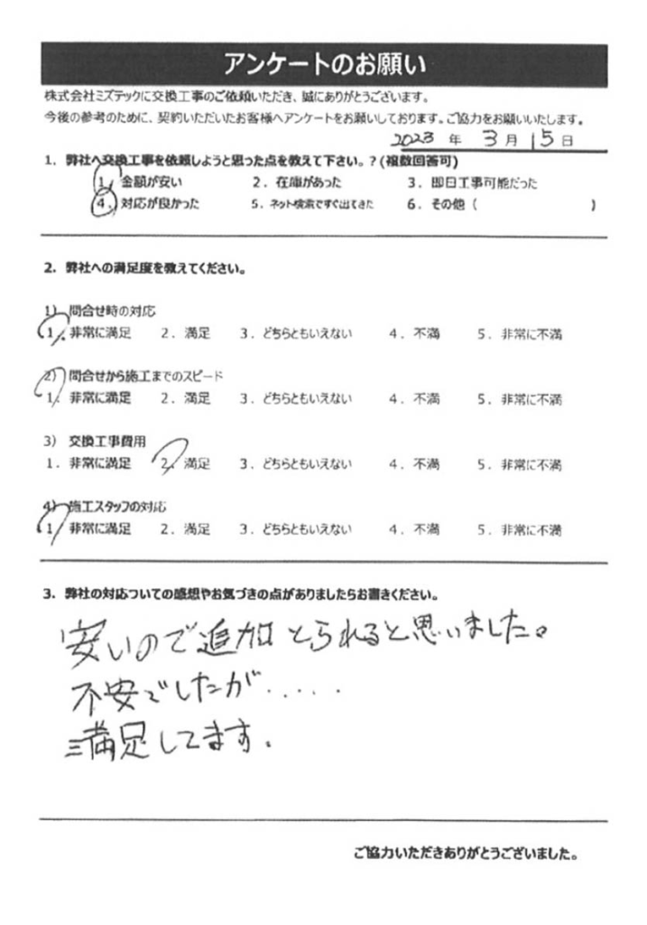 以前より使いやすい機種がつき、しかも他の工事より安い価格で取り替えられて喜んでいます。